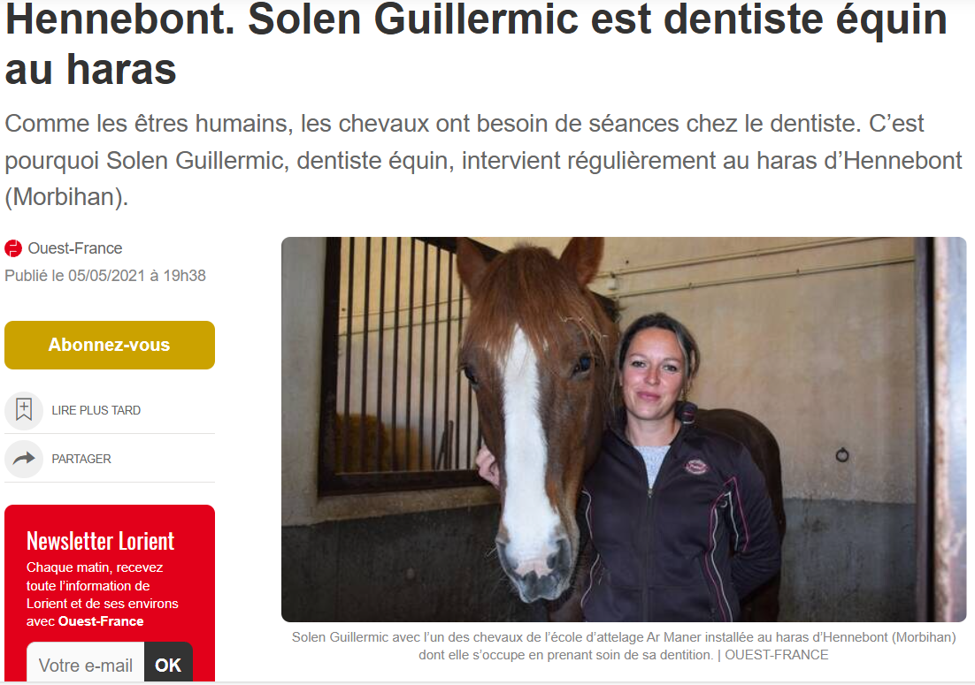 Un bel article qui présente bien la profession de dentiste équin, merci au Ouest France et au Haras National d’Hennebont. Ci-dessous le lien vers l’article, bonne lecture: